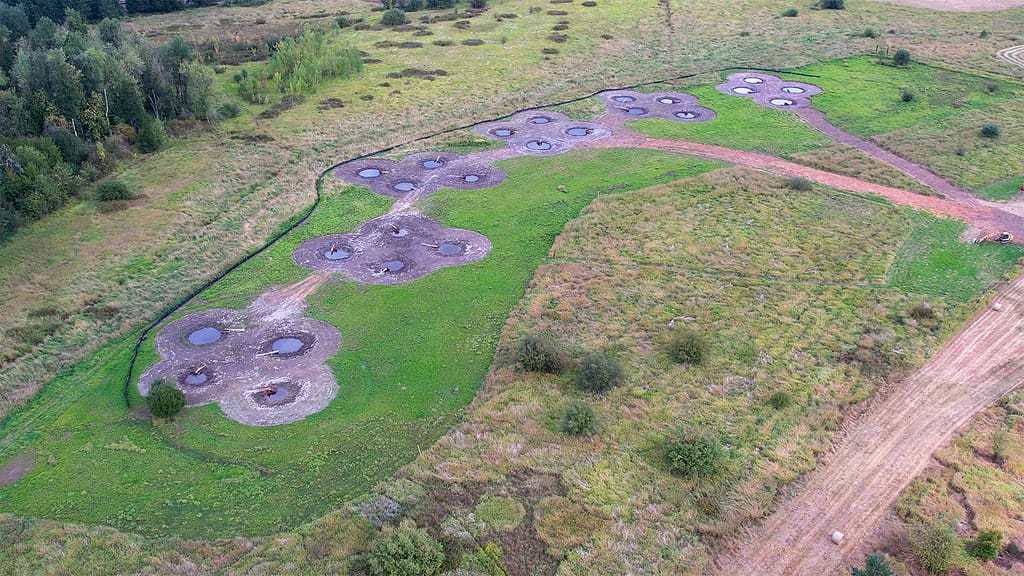 When it was dug roughly 100 years ago, Blooms Ditch created a channel that drained the naturally occurring flood plain, causing the once rich wetland to dry up more frequently. To improve year-round access to water, the Blooms Preserve restoration plan calls for a series of 24 ponds along Blooms Ditch. Each pond has a shallow breeding shelf around the outside and a deeper middle portion for the summer months when water is less abundant. Large woody debris placed around the ponds creates hiding spaces for small creatures.
