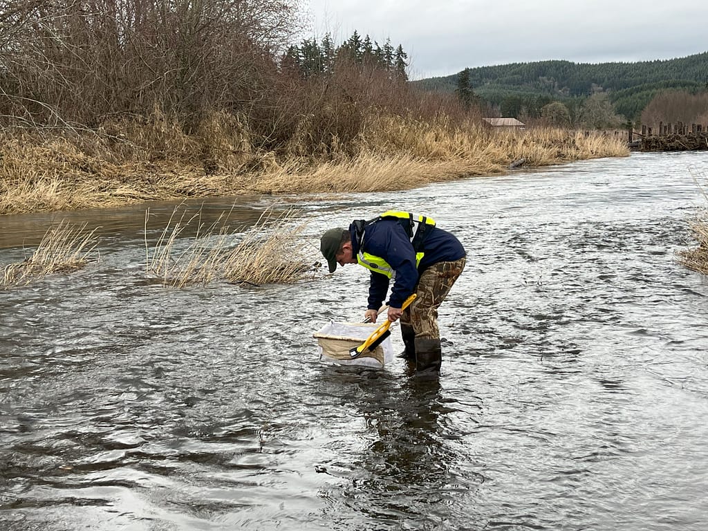 Suited up in waders and a brightly colored personal flotation device, Washington Department of Fish and Wildlife (WDFW) habitat biologist Daron Williams uses a kick net to collect samples from Stillman Creek.