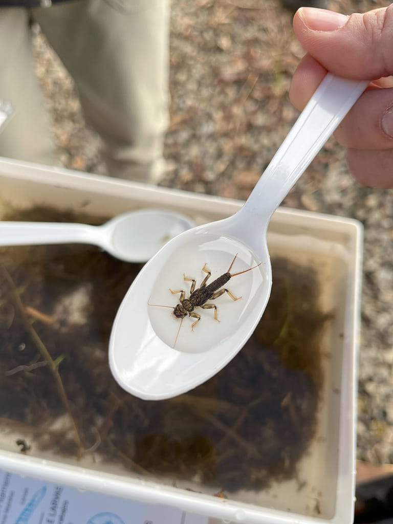 “Aquatic macroinvertebrates are animals that live underwater that are big enough to see without a microscope and don’t have a backbone,” Daron continues. “While there are many types of macroinvertebrates, we are particularly interested in finding species like mayflies, caddisflies, and stoneflies. Not only are they an important food source for salmon, but their presence can also indicate good water quality because of their sensitivity to pollution.”