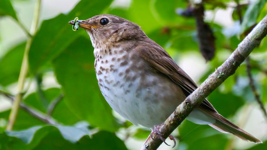 - Swainson’s thrush perched on a branch with a bug in its beak, Mike Melton.