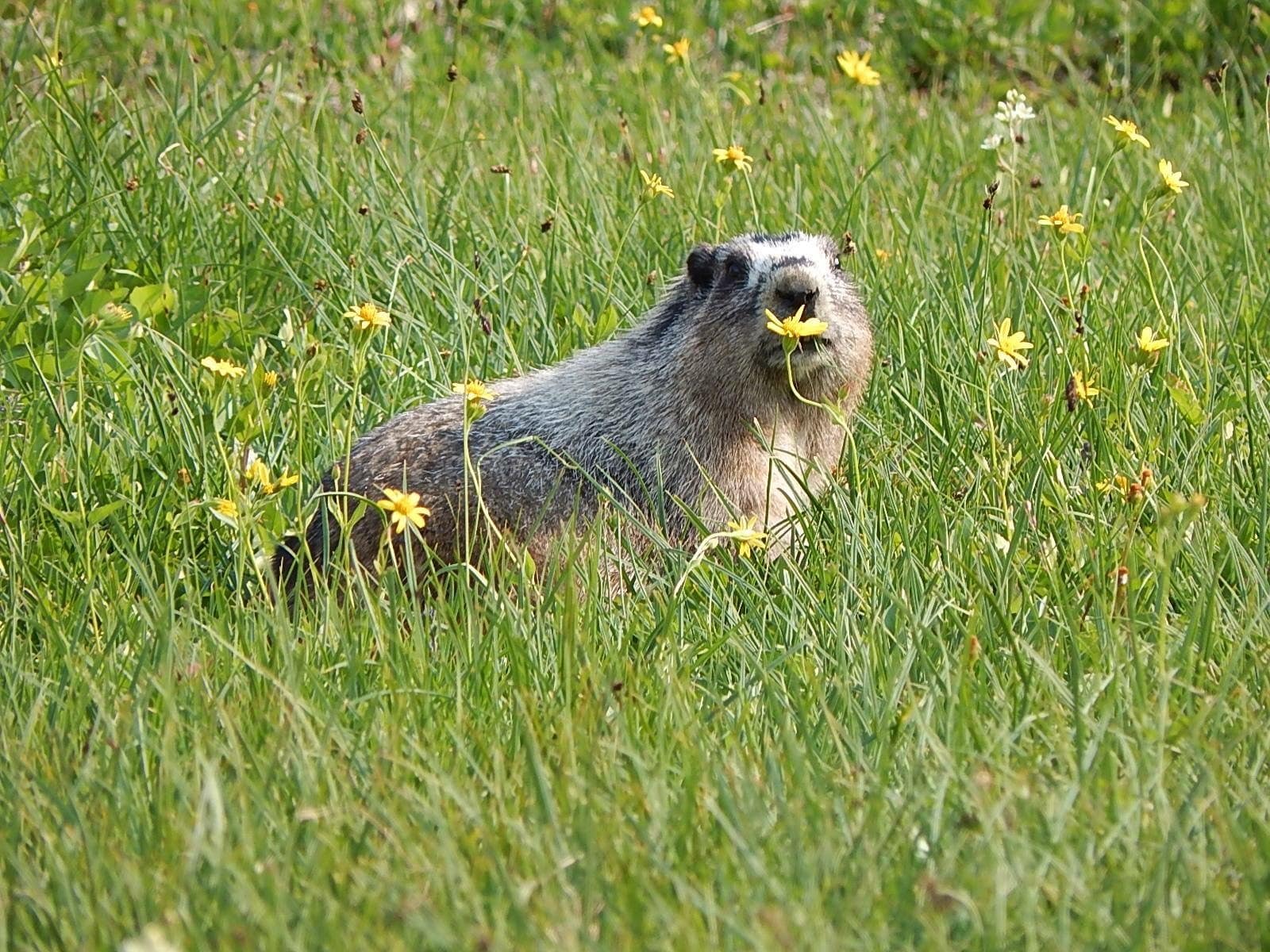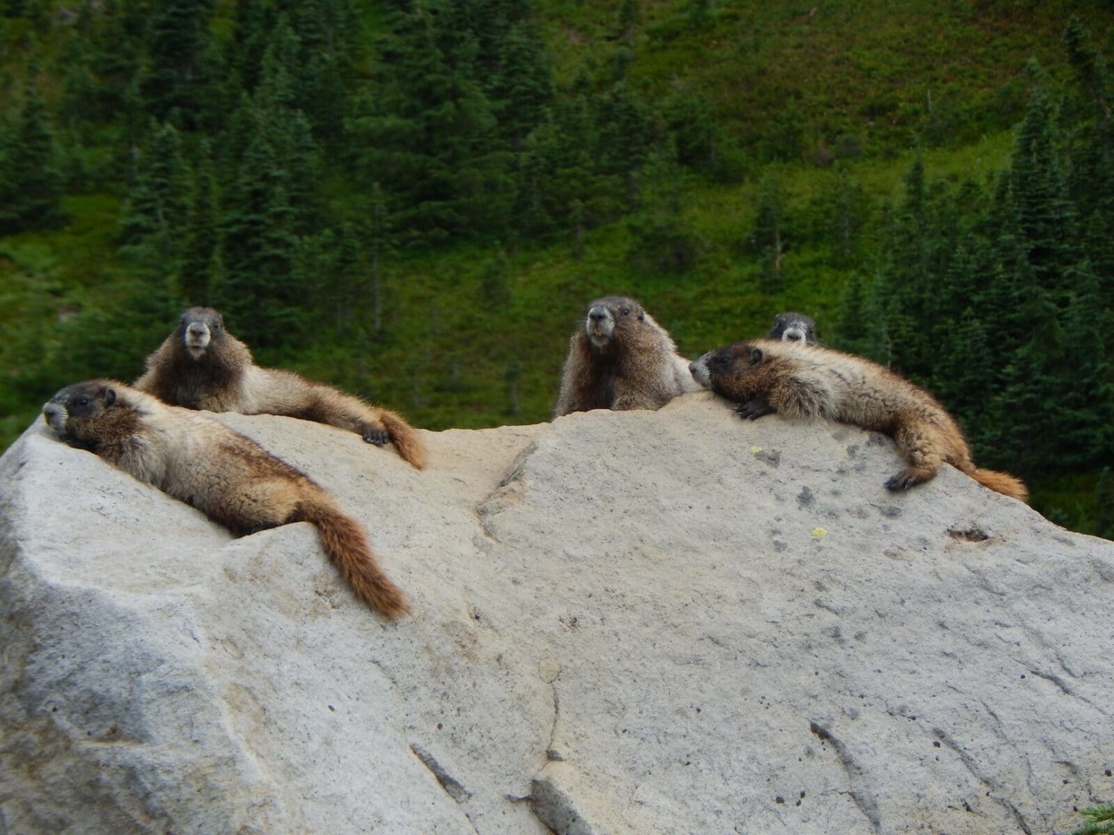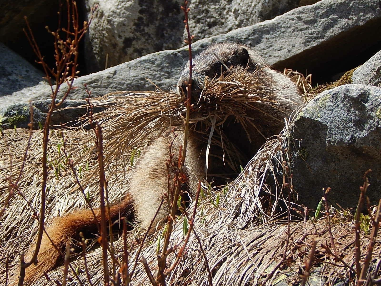 The National Park Service says that hoary marmots spend over half their lives in hibernation! Each marmot builds up sizable fat stores that carry them through eight to nine months of hibernating in their subalpine habitat. During this time, their heartbeat, respiration, and temperature drop significantly. Since their body temperature drops so low, they must wake up every few days to raise their body temperature, urinate, and eat.