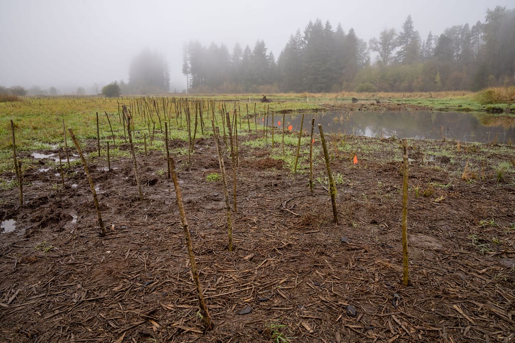 It was one of those rainy fall days where the fog clings low to the earth, highlighting the bold fall colors on nearby trees. It is in this serene setting that a crew from Sound Native Plants has planted nearly 40,000 native plants around newly constructed frog ponds and along Blooms Ditch.