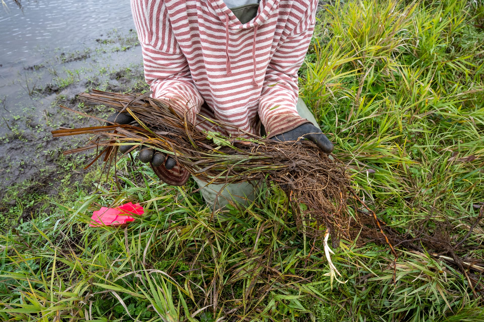 - Sound Native Plants crew member planting wapato.