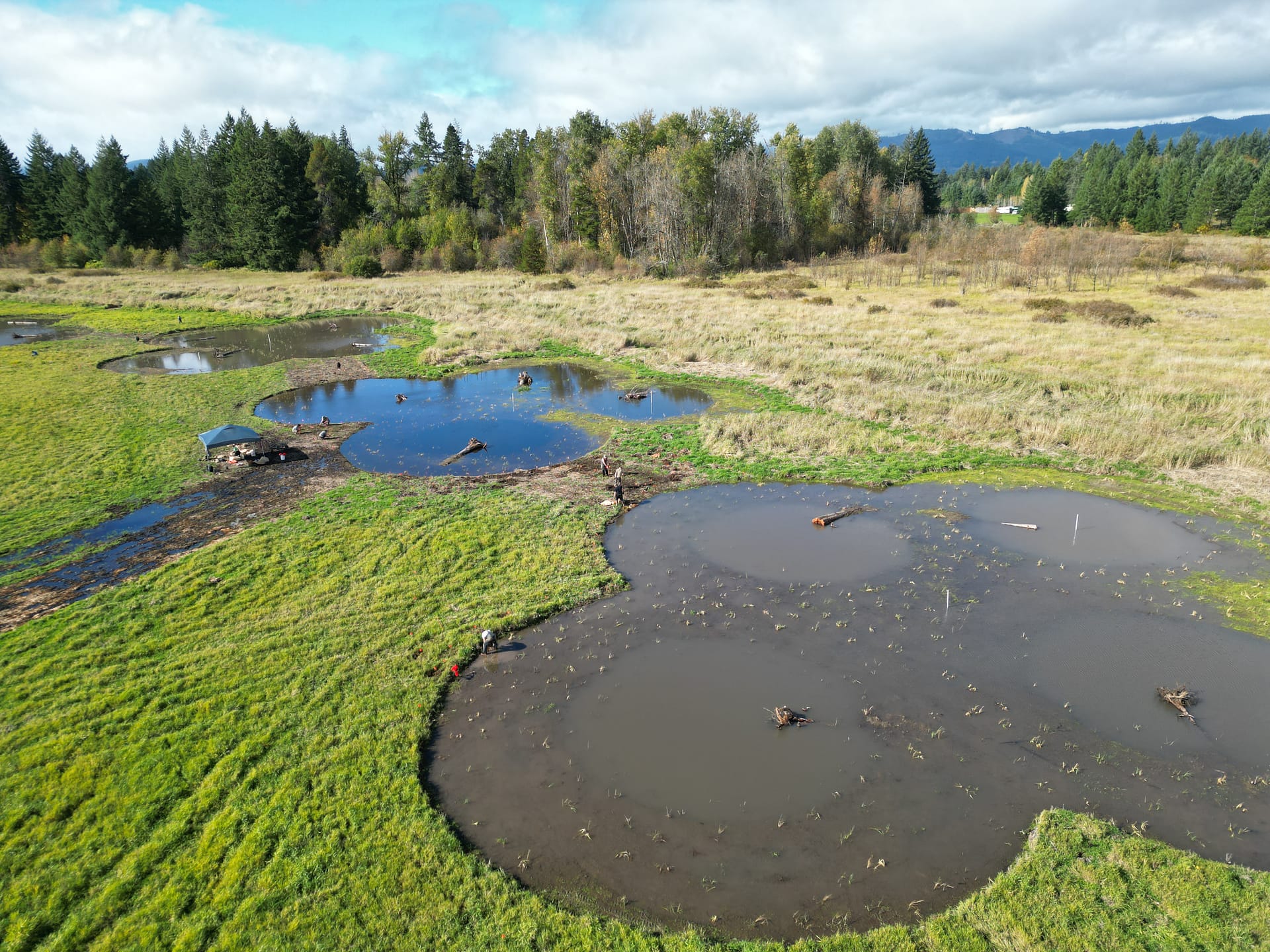 With the needs of the Oregon spotted frog and the weakness of the reed canary grass in mind, planting began in September 2023. Planting started in the middle of the ponds and expanded outwards, eventually reaching Blooms Ditch.