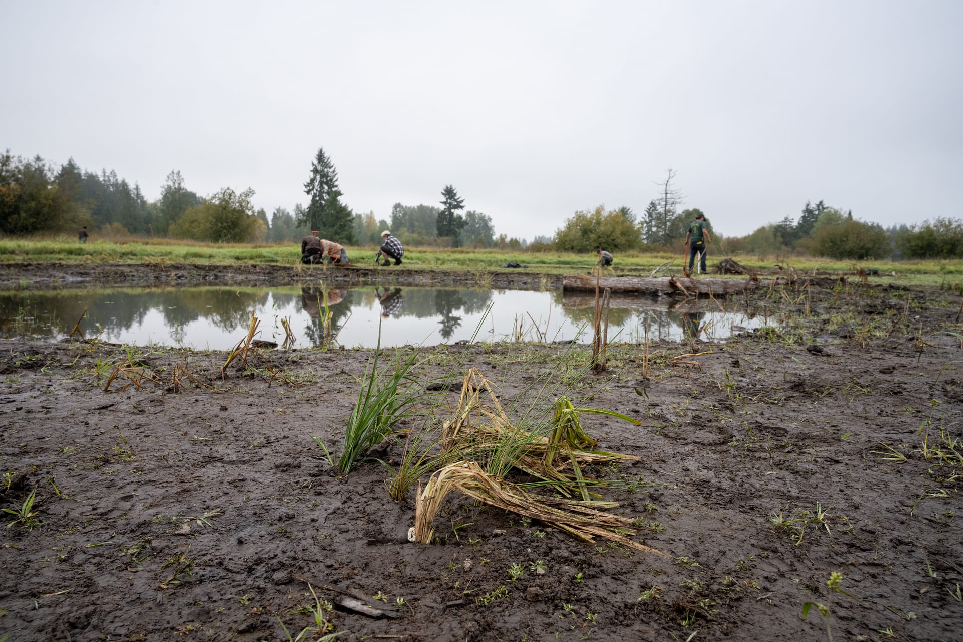 It was one of those rainy fall days where the fog clings low to the earth, highlighting the bold fall colors on nearby trees. It is in this serene setting that a crew from Sound Native Plants has planted nearly 40,000 native plants around newly constructed frog ponds and along Blooms Ditch.