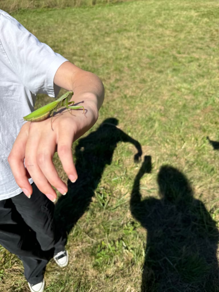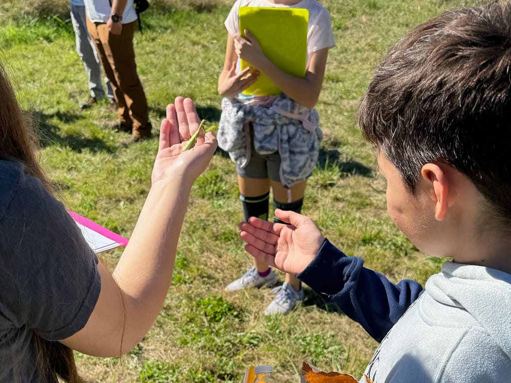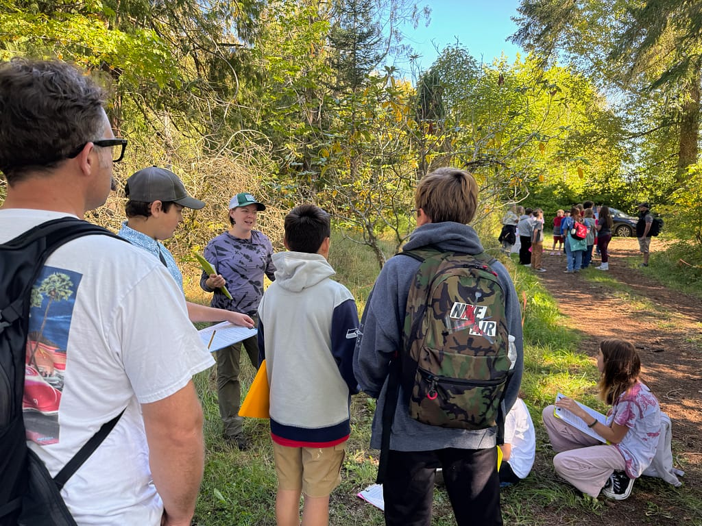 Numerous native plants including Pacific madrone, sword ferns, thimbleberry, and western red cedar are identified at the reference sites. In contrast, the restoration site is dominated by nonnative pasture grass punctuated with nonnative thistle. However, the students find more than just plants at the site, with two praying mantises soon stealing the show. “Well, that was awesome!” exclaims Ellie as she takes a turn holding one of the docile green insects.