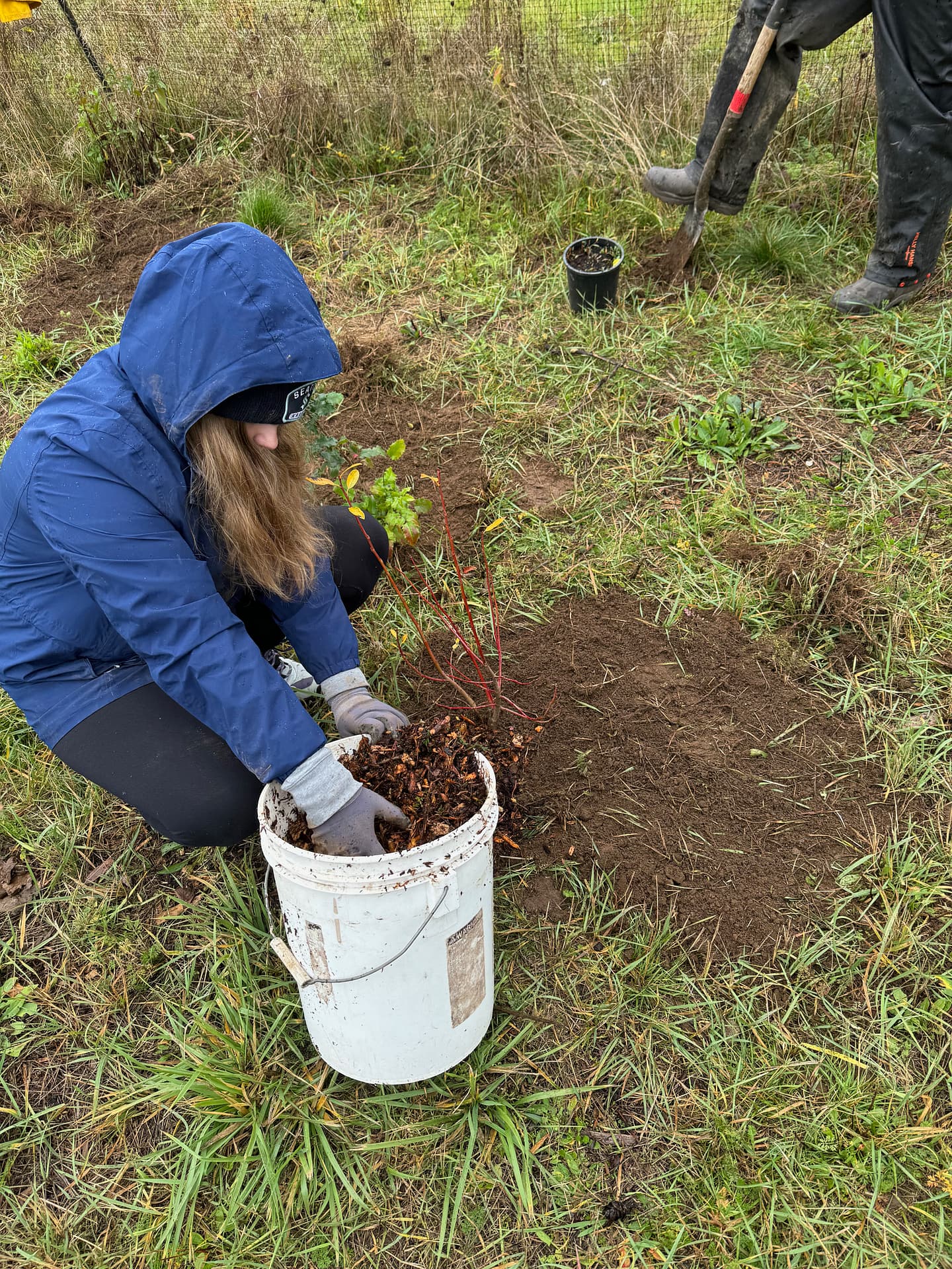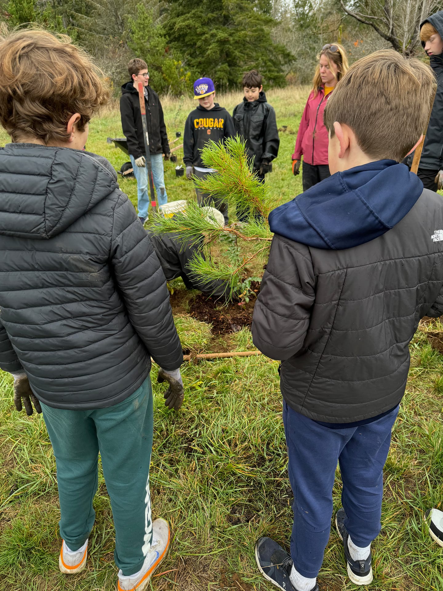 With that, the students-turned-restoration-ecologists set to work digging holes, planting native species like Oregon grape, snowberry, shore pine, nootka rose, and oceanspray, and finally mulching around them. “There, you almost got it, put some elbow grease into it,” one student says encouragingly. Nearby, another informs their partner, “That’s deep enough, we can plant now.” Still others are on the quest for mulch, dutifully shoveled by those already finished planting. As Adalynne fills a wheelbarrow for her classmates, she proudly declares, “I like to push myself to my limits to find out what I’m capable of.”