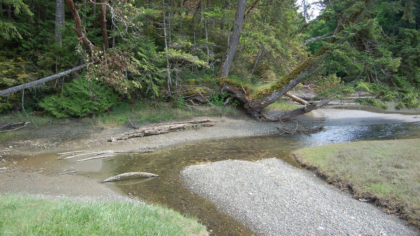 Near the start of the project, Laurence visited the site with Dave and Joanne to assess its potential. What they found was a pocket estuary in relatively pristine condition, with many acres of neighboring forest and wetlands that provide clean fresh water. The property, known locally as Adams Cove, includes a protective sand spit at the estuary entrance, a beach used by spawning forage fish, an intertidal salt marsh, and mudflats providing habitat for Puget Sound coho, winter steelhead, chinook, summer chum, and coastal sea-run cutthroat.