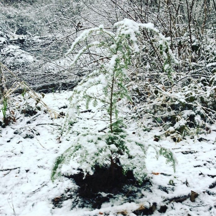 I’ve had many memorable moments during restoration volunteer events, and I have been lucky enough to have been supported by over 250 volunteers. A restoration event that sticks out in my mind was at Capitol Land Trust’s Hilburn Preserve in February. This event was the same day that the snowstorm rolled into the region. Eight hard-working volunteers planted 225 trees along Goldsborough Creek. Luckily, we were able to finish an hour early. By the time everyone had left, there was a good dusting of snow on the ground.