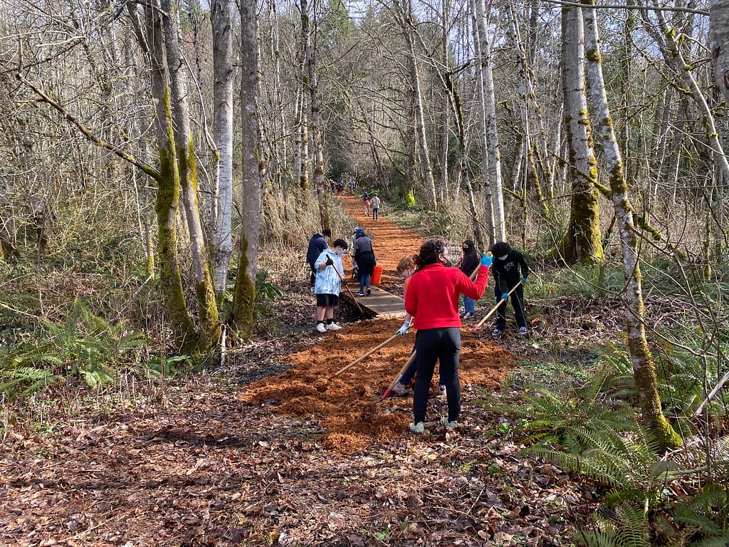 - Students mulch a trail.