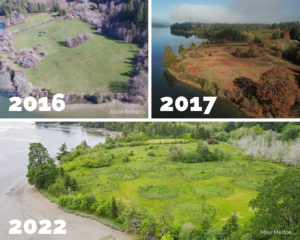 The northwest corner of the property—formerly used for agriculture—now sports thirty-five circular areas replanted with native species like Oregon ash, serviceberry, Nootka rose, Garry oak, Wapato, willow, and more. In just six years, plants are flourishing—spreading and beginning to reproduce. A wetland on the field’s eastern side has expanded and even supports beaver now! With better water retention on the site, naturally occurring wetland plants like cattails, rushes, and sedges have multiplied.
