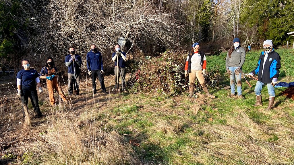 Justine says that some of her most memorable projects were our 2020 and 2021 Martin Luther King Jr. Day of Service events and our 2020 Orca Recovery Day event. These three projects mobilized 100 community members to address habitat degradation in our forests and on our shorelines. With the help of our partners Native Plant Salvage and Mason Conservation District, invasive English ivy and Himalayan blackberry were removed, and native trees and shrubs were planted. Justine reflects, “It was a joy to work with our partners so closely and work together to accomplish even more on these important days of service!”