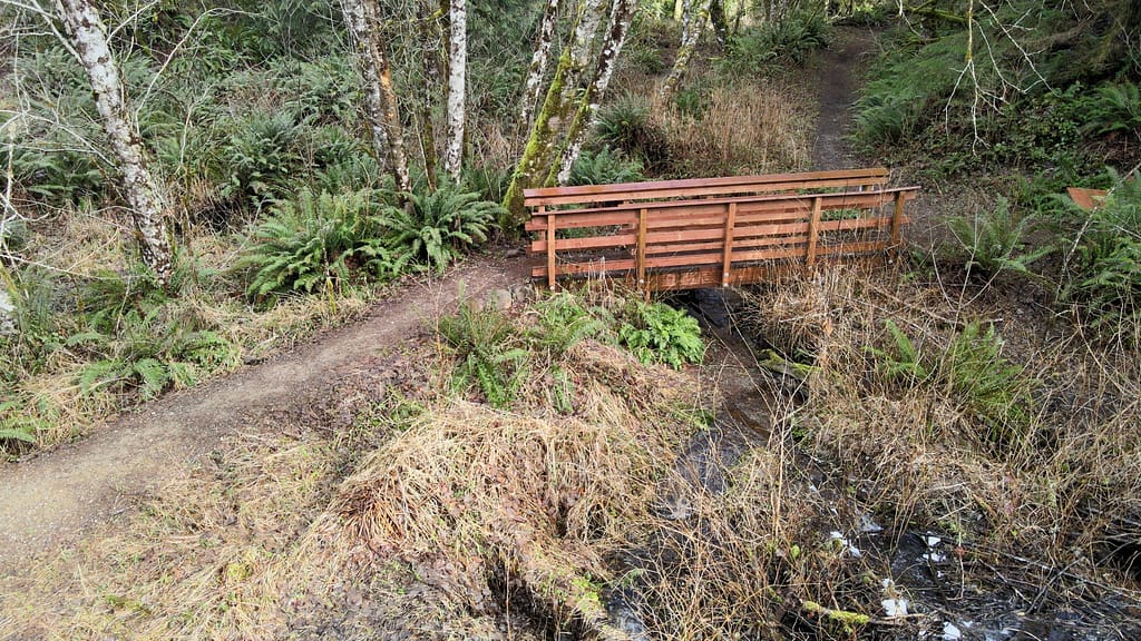 Your eyes may notice several beaver dams around the preserve and your nose may catch a whiff of Douglas fir sap and needles. There’s even an edible native berry or two along the way! Darlin Creek Preserve has three benches along the Wetland Forest Loop Trail (one of these is also along the Lake Loop Trail) and several fun bridge crossings.