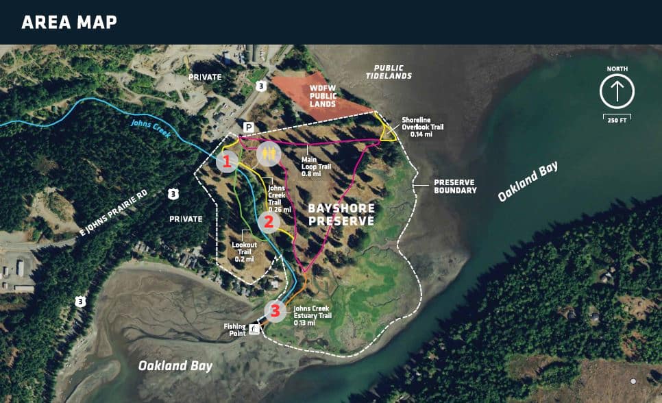 No. Parking at Bayshore Preserve is free. On Salmon Experience days overflow parking will be available. Please note that overflow parking is only available for Salmon Days from 10:00 am – 2:00 pm on November 8, 9, and 11. For additional parking, drive north along Highway 3 to the Washington Department of Fish & Wildlife’s parking lot, located here. Please note that a Discover Pass is needed for this lot.