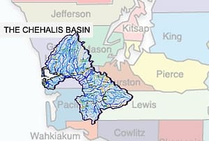Expansive is one word to describe the second largest watershed in Washington State: the Chehalis River Basin. Shaped like an askew moth, the tip of one wing reaches 5,000 feet in elevation to drain south out of the Olympic mountains. The other wing drains to the west from the Deschutes River, and towards the north, draining Willapa Hills. The Chehalis River watershed sprawls over 2,600 square miles, with 11 sub-basins bringing together 3,300 miles of streams and rivers.