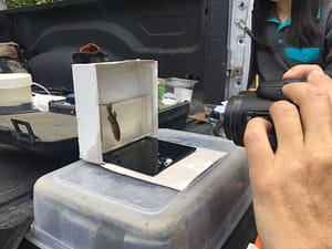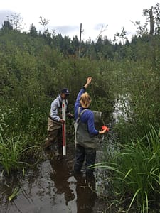 To conduct the regular monthly sampling, AmeriCorps Conservation Scientists Carlisha and Olivia begin by setting out 30 bait traps. Creatures enter the trap and are not able to exit. The following morning, they collect each trap recording all species found and taking other measurements like temperature and vegetation cover. Olympic mudminnow are weighed, measured, and photographed to detect changes in body condition and spawning readiness over time. By monitoring this population, they can detect data differences between seasonal changes in the wetland and changes in the mudminnow population over time.