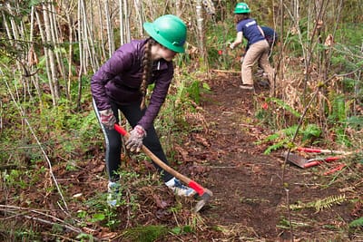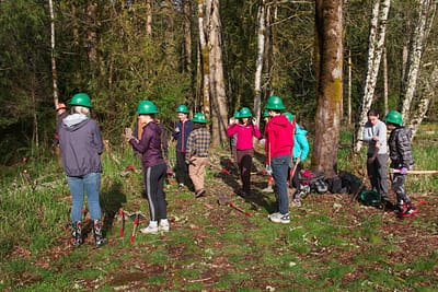 During April and May, Capitol Land Trust and Washington Trails Association teamed up to begin building the first new trail at Darlin Creek Preserve. On the west side of the property, a seasonal stream continuously flooded out an existing trail. Students from Olympia High School and Capital High School began the project by clearing a 300-foot pathway away from the stream. 34 additional volunteers including a Boy Scout troop, adults, and other children completed the new trail and decommissioned the old trail.