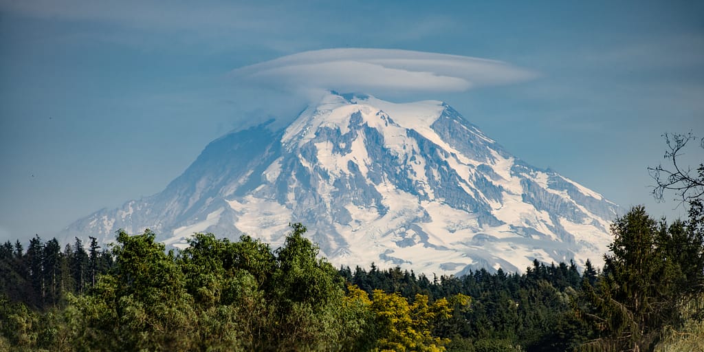 There are times in late summer when we have cloudless days… except for one. Across a stretch of blue sky, a peculiar cloud hovers over the top of Mt. Rainier. It can look like a disc, or a funnel, or a pyramid, but it clearly has a relationship with the mountain. This type of cloud is a useful indicator for the weather ahead, and is called a lenticular cloud.