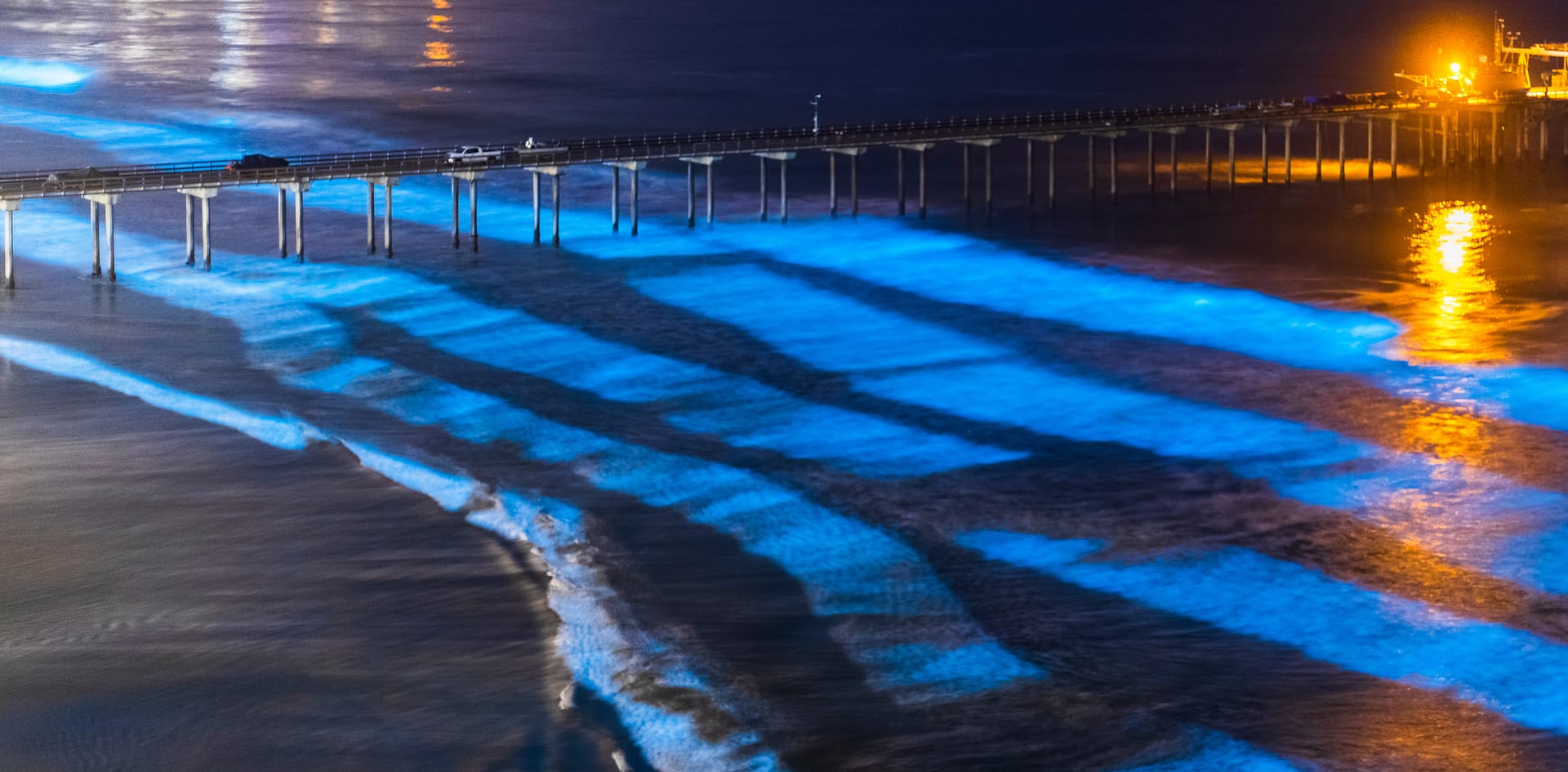 Have you ever seen the waters of the ocean or the Puget Sound glow during a dark summer night? When conditions are right, a type of bioluminescent phytoplankton blooms and causes waves or other water disturbances to glow a bright blue. These phytoplankton thrive in the nutrient-rich waters of the west coast. When the phytoplankton have enough energy and are in present in large quantities, their glow is visible to the naked eye.