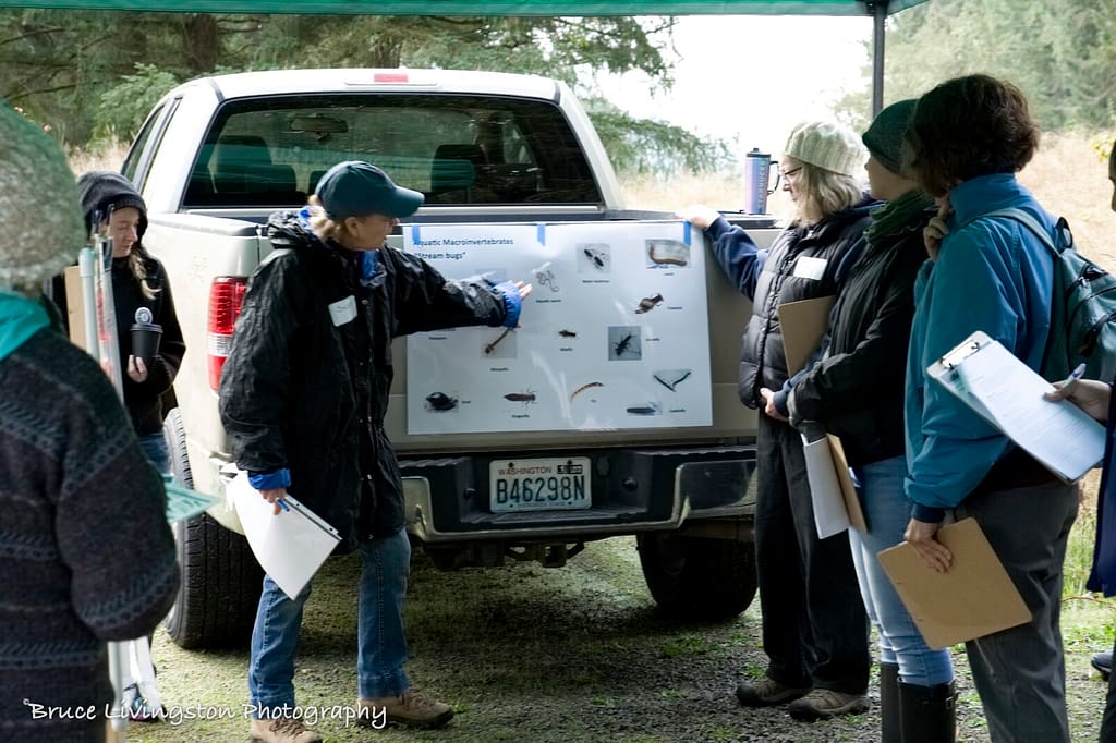 Susie teaching education volunteers about stream bugs at Bayshore Preserve